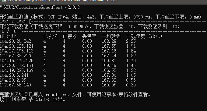 测速完毕后,默认会显示最快的 10 个 IP。默认下载测速地址的文件大小只有 300MB,如果你速度太快的话,测速结果可能会低于实际速度。因为每次测速都是在每个 IP 段中随机 IP,所以每次的测速结果都不可能相同,这是正常的!