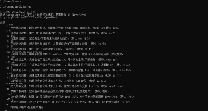 CloudflareSpeedTest直接运行使用的是默认参数,如果想要测速结果更全面、更符合自己的要求,可以自定义参数。(点击放大)