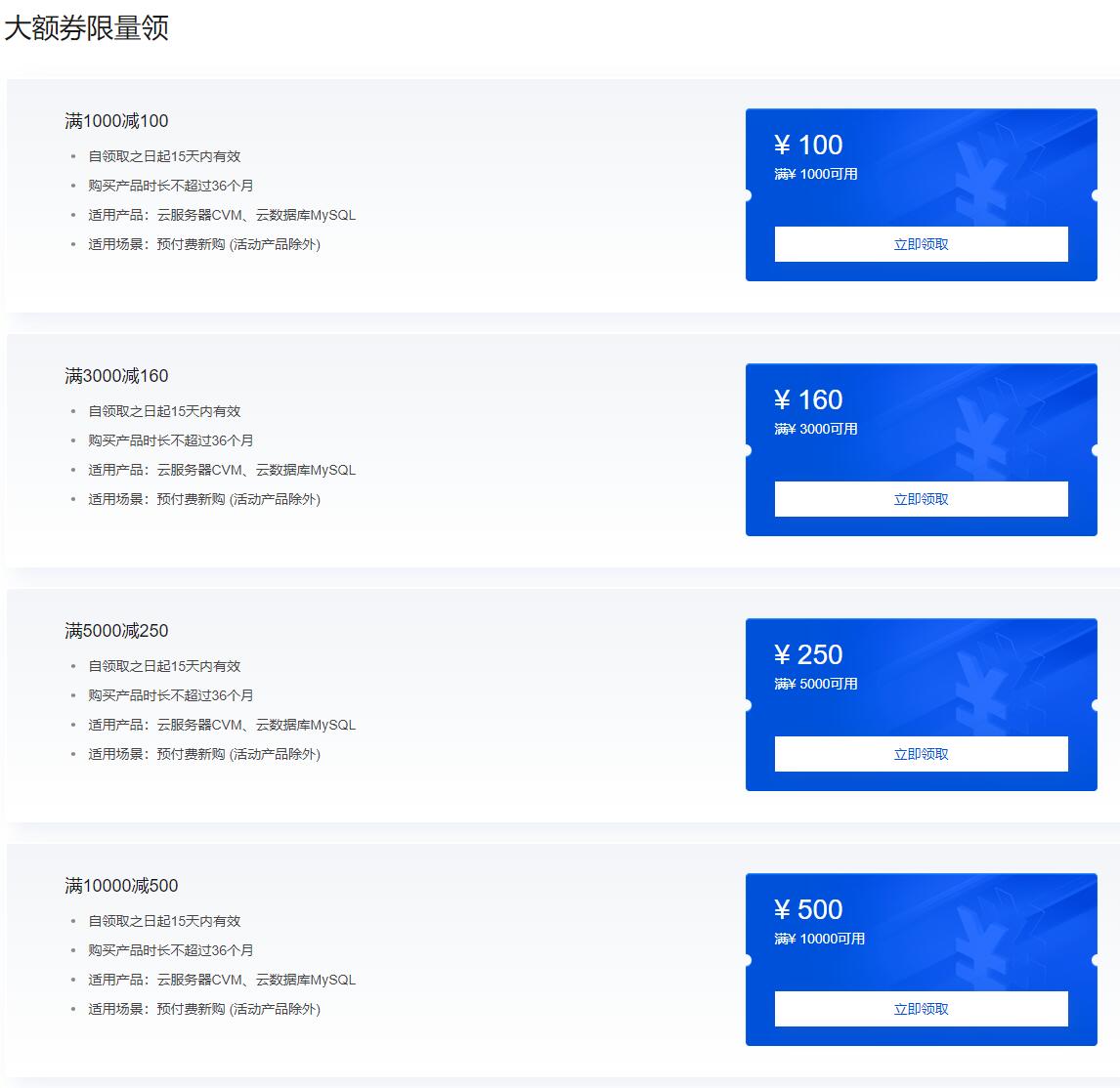 注意:所有代金券自领取之日起15天内有效,购买产品时长不超过36个月,适用产品:云服务器CVM、云数据库MySQL,适用场景:预付费新购 (活动产品除外)