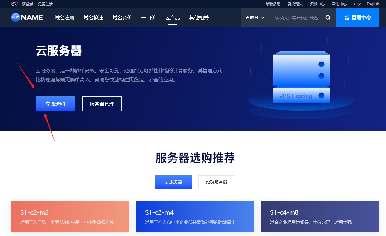 进入JINNAME官网首页,点击【云产品】-【云服务器】,然后点击【立即购买】,如下图所示:进入云服务器购买页面: