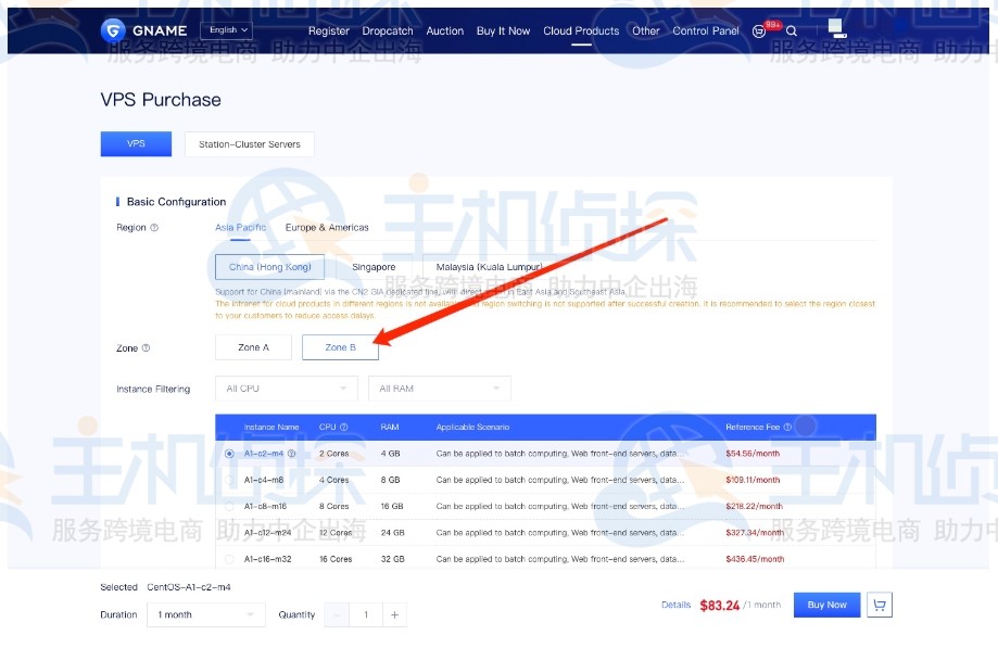 进入【云服务器购买】页面,如果希望在中国(香港)区域购买A系列云服务器,请在可用区选项中选择【可用区B】,然后可以选择所需的A系列云服务器配置,如下图所示: