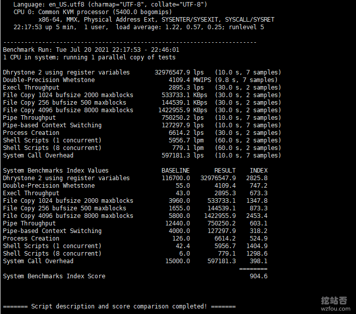 这是1GB内存的CN2 GIA VPS主机的unixbench性能跑分结果,得分在900。(点击放大)