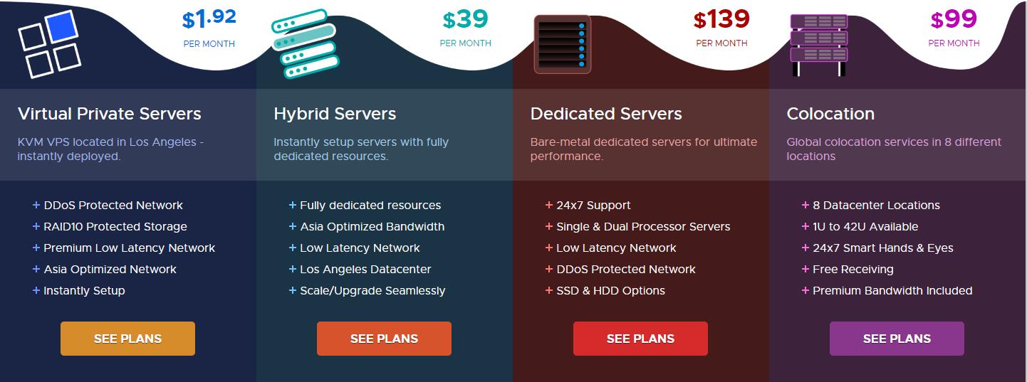 RackNerd的服务器有亚洲带宽优化,所以国内用户访问都还是比较快的。价格最便宜的是他们家Hybrid独立服务器,2核CPU、4GB内存、120GB存储、1TB流量,采用1Gbps带宽,价格是39元/月。