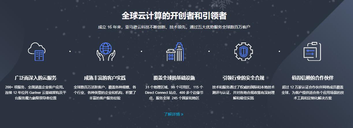 主机商介绍:亚马逊云科技(Amazon Web Services)是全球云计算的开创者和引领者,15 年来一直以不断创新、技术领先、服务丰富、应用广泛而享誉业界。亚马逊云科技可以支持几乎云上任意工作负载。亚马逊云科技目前提供超过 200 项全功能的服务,涵盖计算、存储、网络、数据库、数据分析、机器人、机器学习与人工智能、物联网、移动、安全、混合云、虚拟现实与增强现实、媒体,以及应用开发、部署与管理等方面;基础设施遍及 26 个地理区域的 84 个可用区,并计划新建8个区域和24个可用区。