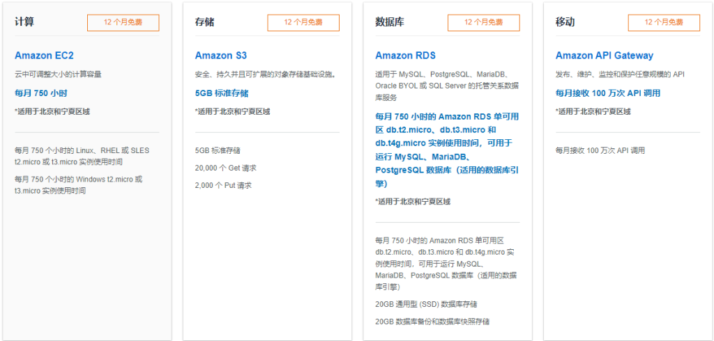 这些免费套餐产品仅适用于适用于现有客户,在自账户创建之日起一年内免费使用该产品,或者自 亚马逊云科技中国(宁夏)区域免费套餐启动之日起 12 个月内免费使用该产品。