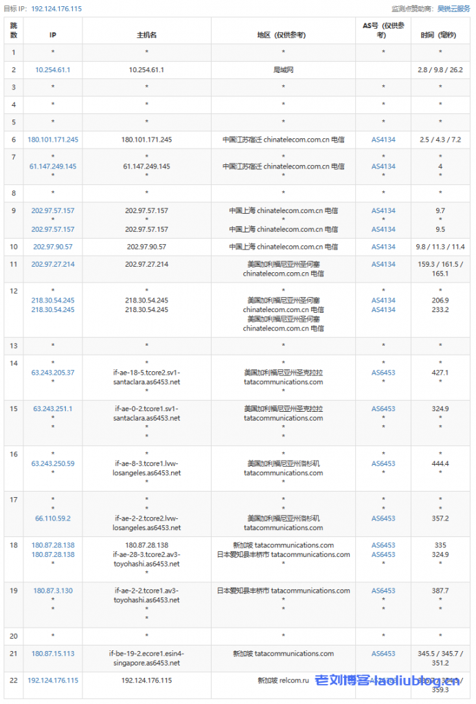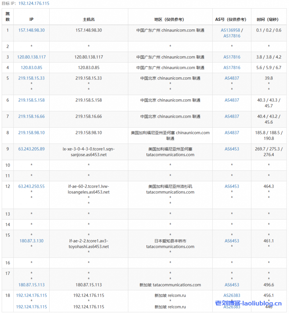 联通去程:直连联通美国洛杉矶节点然后走TATA经过日本去新加坡