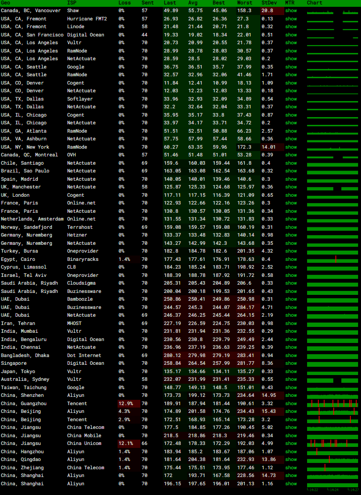 从全球节点看PING速度,国内速度还可以,有点丢包。