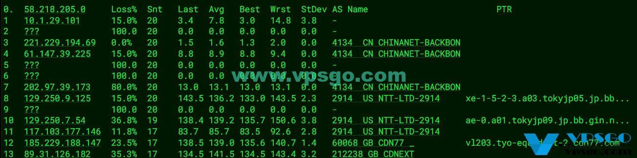 traceroute to 14.215.116.1 (14.215.116.1), 30 hops max, 32 byte packets 1 89.31.126.130 0.27 ms AS212238 Japan, Tokyo, thinkhuge.net 2 vl201.tyo-eq8-core-1.cdn77.com (185.229.188.144) 0.29 ms AS60068 Japan, Tokyo, cdn77.com 3 ae-14.a01.tokyjp09.jp.bb.gin.ntt.net (117.103.177.145) 0.36 ms AS2914 Japan, Tokyo, ntt.com 4 * 5 ae-1.a03.tokyjp05.jp.bb.gin.ntt.net (129.250.5.94) 0.79 ms AS2914 Japan, Tokyo, ntt.com 6 * 7 * 8 * 9 14.149.72.6 116.41 ms AS134764 China, Guangdong, Foshan, ChinaTelecom 10 * 11 174.72.145.61.broad.fs.gd.dynamic.163data.com.cn (61.145.72.174) 114.30 ms AS134764 China, Guangdong, Foshan, ChinaTelecom 12 * 13 182.72.145.61.broad.fs.gd.dynamic.163data.com.cn (61.145.72.182) 119.12 ms AS134764 China, Guangdong, Foshan, ChinaTelecom 14 * 15 * 16 * 17 182.72.145.61.broad.fs.gd.dynamic.163data.com.cn (61.145.72.182) 121.29 ms AS134764 China, Guangdong, Foshan, ChinaTelecom 18 * 19 182.72.145.61.broad.fs.gd.dynamic.163data.com.cn (61.145.72.182) 119.53 ms AS134764 China, Guangdong, Foshan, ChinaTelecom 20 * 21 182.72.145.61.broad.fs.gd.dynamic.163data.com.cn (61.145.72.182) 115.55 ms AS134764 China, Guangdong, Foshan, ChinaTelecom 22 * 23 * 24 * 25 182.72.145.61.broad.fs.gd.dynamic.163data.com.cn (61.145.72.182) 118.09 ms AS134764 China, Guangdong, Foshan, ChinaTelecom 26 * 27 * 28 * 29 182.72.145.61.broad.fs.gd.dynamic.163data.com.cn (61.145.72.182) 118.60 ms AS134764 China, Guangdong, Foshan, ChinaTelecom