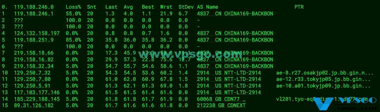 traceroute to 119.6.6.6 (119.6.6.6), 30 hops max, 32 byte packets 1 89.31.126.130 0.28 ms AS212238 Japan, Tokyo, thinkhuge.net 2 vl202.tyo-eq8-core-2.cdn77.com (138.199.0.212) 0.26 ms AS60068 Japan, Tokyo, cdn77.com 3 ae-22.a01.tokyjp09.jp.bb.gin.ntt.net (61.200.82.185) 0.50 ms AS2914 Japan, Tokyo, ntt.com 4 * 5 ae-9.r03.tokyjp05.jp.bb.gin.ntt.net (129.250.5.45) 1.30 ms AS2914 Japan, Tokyo, ntt.com 6 xe-0.cnc-g.tokyjp05.jp.bb.gin.ntt.net (129.250.8.94) 84.23 ms AS2914 Japan, Tokyo, ntt.com 7 219.158.115.158 99.88 ms AS4837 China, Guangdong, Guangzhou, ChinaUnicom 8 219.158.3.165 109.86 ms AS4837 China, Guangdong, Guangzhou, ChinaUnicom 9 * 10 * 11 119.6.197.194 129.42 ms AS4837 China, Sichuan, Chengdu, ChinaUnicom 12 119.6.195.38 131.52 ms AS4837 China, Sichuan, Chengdu, ChinaUnicom 13 119.6.6.6 104.20 ms AS4837 China, Sichuan, Chengdu, ChinaUnicom