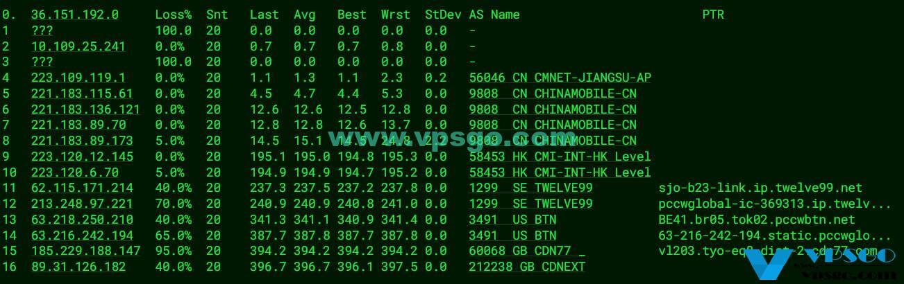 traceroute to 120.204.197.126 (120.204.197.126), 30 hops max, 32 byte packets 1 89.31.126.130 0.50 ms AS212238 Japan, Tokyo, thinkhuge.net 2 vl201.tyo-eq8-core-1.cdn77.com (185.229.188.144) 3.03 ms AS60068 Japan, Tokyo, cdn77.com 3 63-216-242-193.static.pccwglobal.net (63.216.242.193) 0.71 ms AS3491,AS31713 Japan, Tokyo, pccw.com 4 * 5 TenGE0-2-0-0.br04.sjo01.pccwbtn.net (63.218.178.50) 181.86 ms AS3491,AS31713 United States, California, San Jose, pccw.com 6 63-217-21-122.static.pccwglobal.net (63.217.21.122) 181.92 ms AS3491,AS31713 United States, California, San Jose, pccw.com 7 223.120.6.69 181.93 ms AS58453 United States, California, San Jose, ChinaMobile 8 223.120.12.138 363.46 ms AS58453 China, Shanghai, ChinaMobile 9 221.183.89.174 380.85 ms AS9808 China, Shanghai, ChinaMobile 10 221.183.89.69 408.65 ms AS9808 China, Shanghai, ChinaMobile 11 221.183.89.46 416.54 ms AS9808 China, Shanghai, ChinaMobile 12 * 13 120.204.194.14 370.48 ms AS9808 China, Shanghai, ChinaMobile 14 120.204.197.126 366.66 ms AS9808 China, Shanghai, ChinaMobile