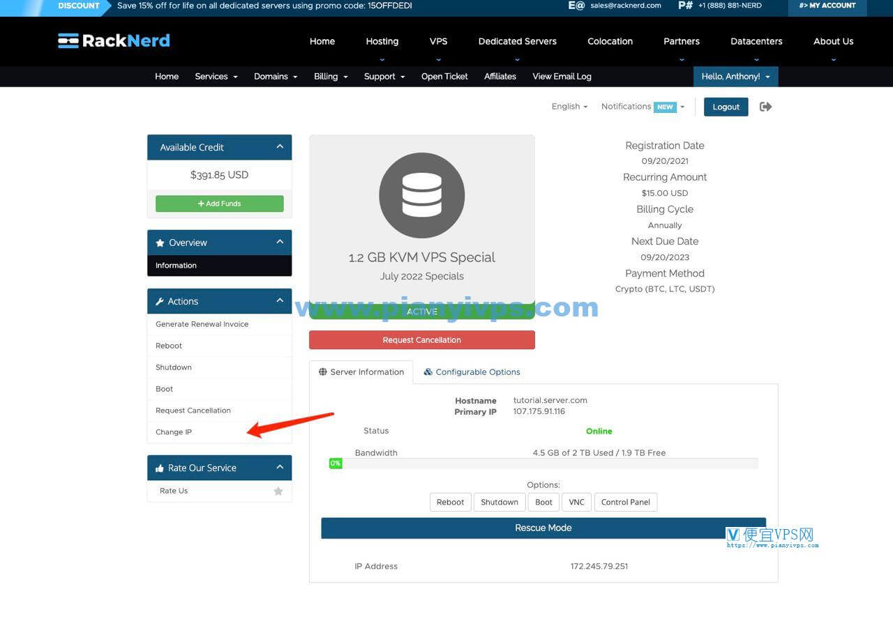 最近 RackNerd 在后台上线了一个新的功能:Change IP,就是一键更换 VPS 的 IPv4 地址,对于购买时间不超过 3 天 72小时的 VPS 套餐,可以免费更换 IP,而购买时长超过 3 天的套餐,则需要支付 3 美元。