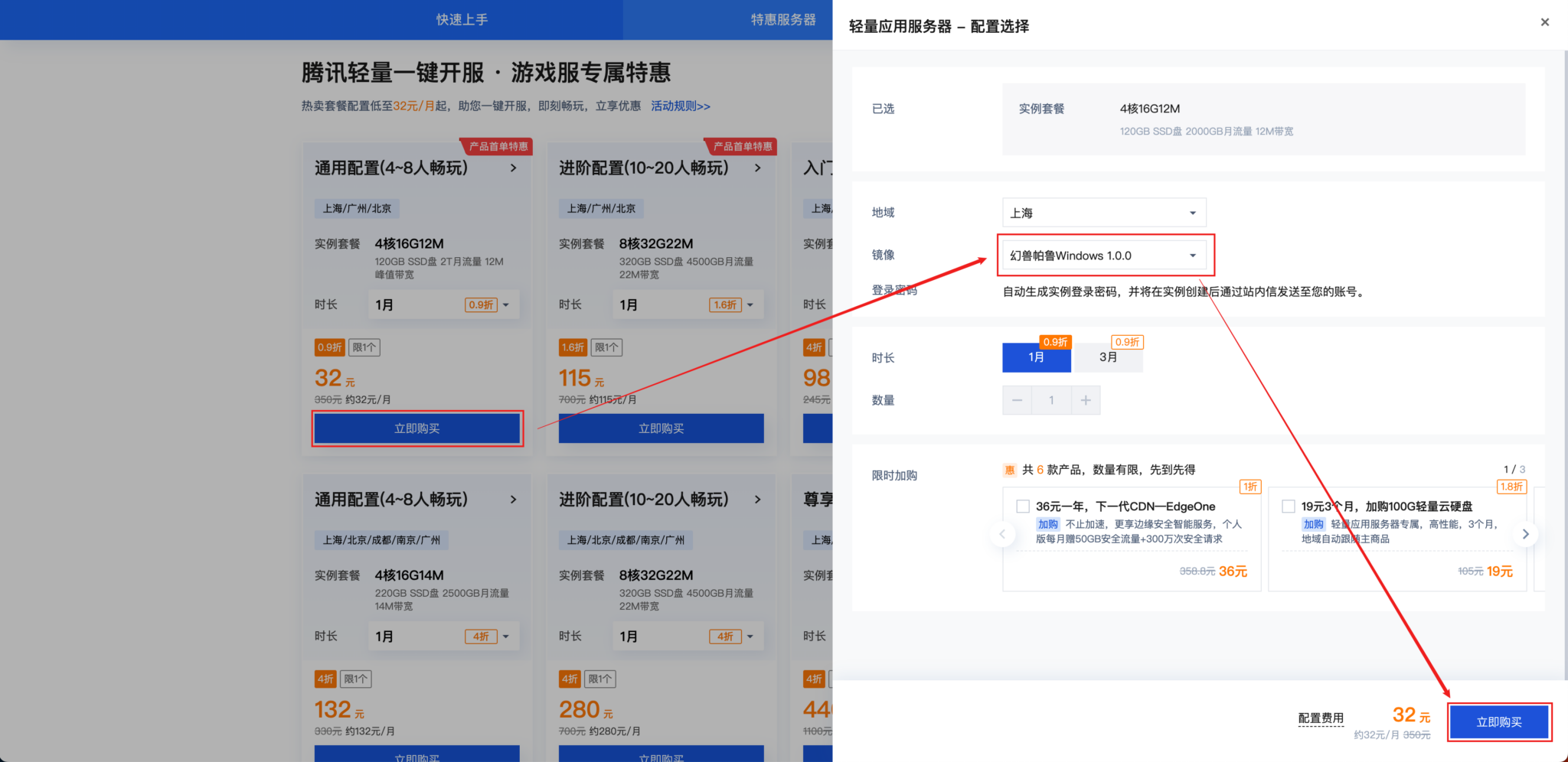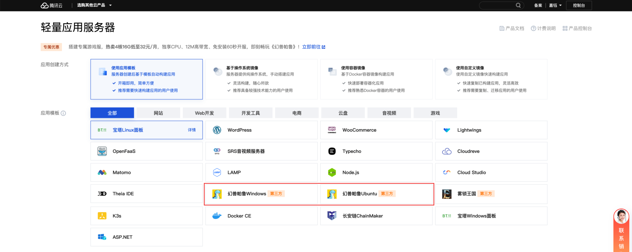 腾讯云为你提供了第三方应用模板(幻兽帕鲁Windows和幻兽帕鲁Linux),全自动部署幻兽帕鲁游戏服务器,仅需轻点三次鼠标,即刻开玩,并有可视化游戏配置面板,启停游戏、配置游戏参数,极致体验唾手可得。更有游戏服务器主题优惠活动可全自动部署),热卖4核16G游戏服套餐低至26元/月起,10秒即刻开启畅玩。