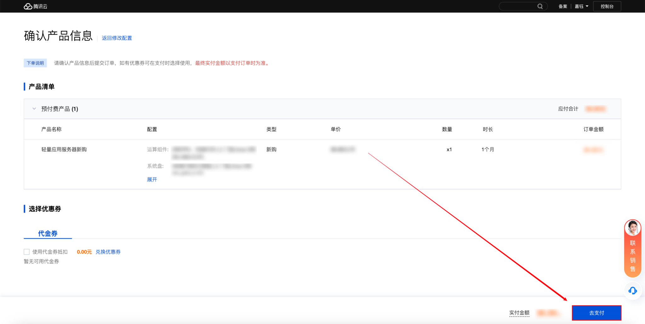 2、确认购买所需的其余选项后,并单击立即购买即可: