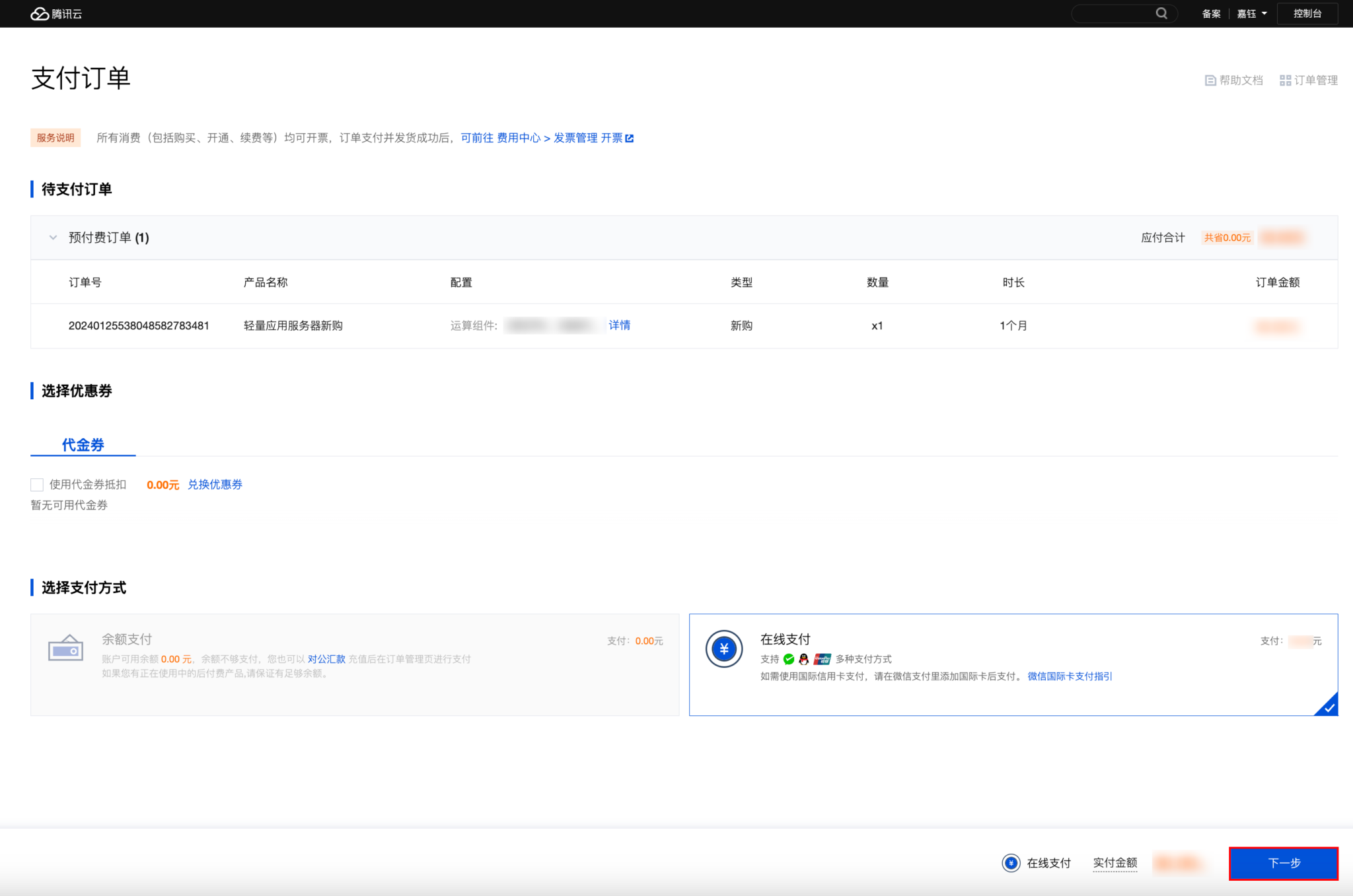 4、您可选择使用余额或在线支付。如您选择在线支付,则需要点击下一步。