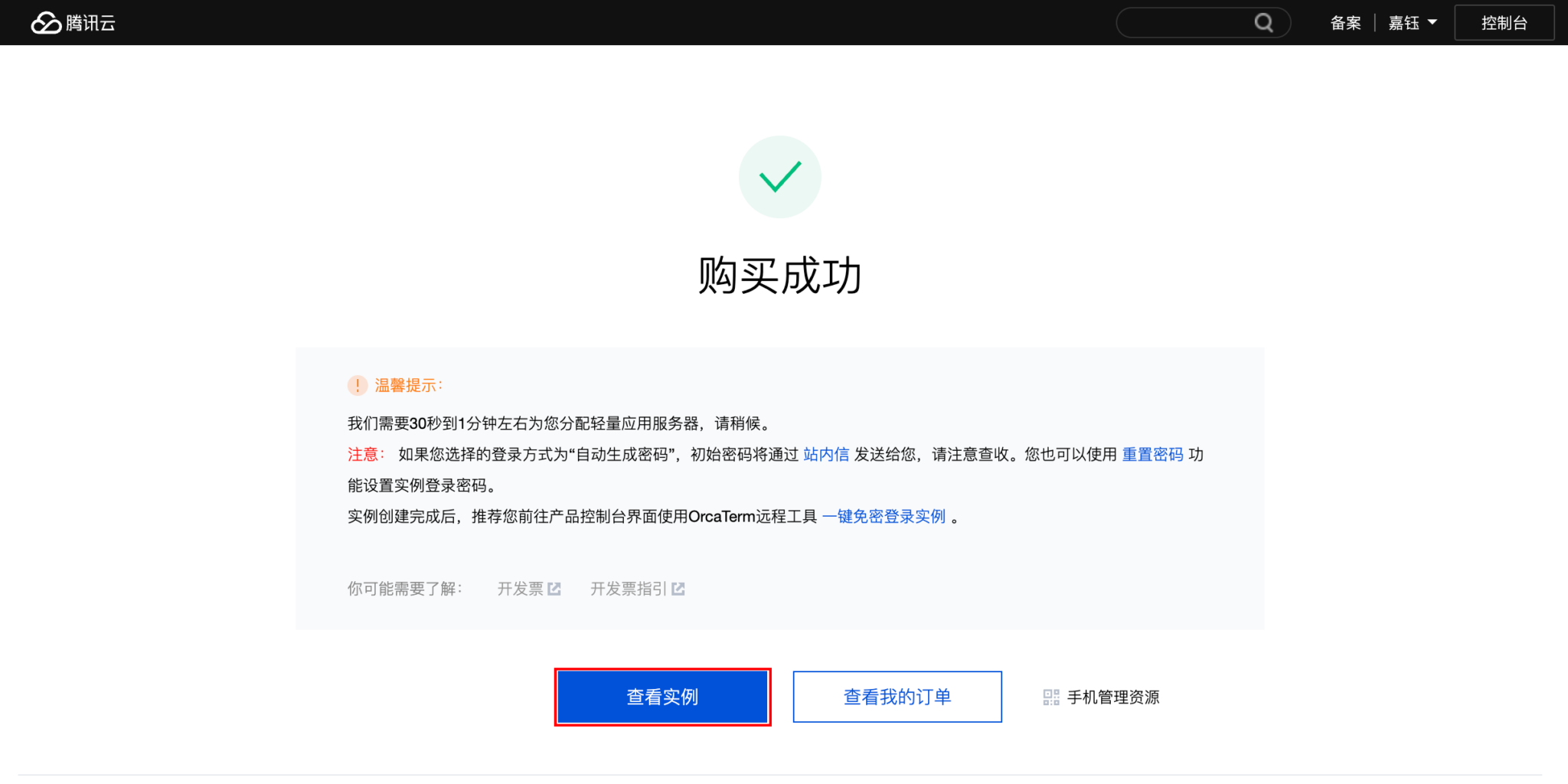 5、支付成功后,您将来到支付成功页,点击“查看实例”,即可前往轻量应用服务器控制台查看刚刚购买的服务器。