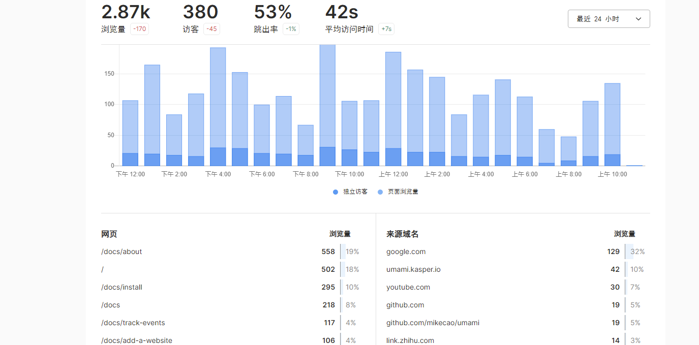 Umami占用资源小,基于Node.js开发,相对于Matomo直接跑在PHP空间的便捷,Umami需要Node.js环境。不过,推荐使用Docker来安装Umami,搭配Nginx反代,在VPS主机上运行Umami还是挺简单的。