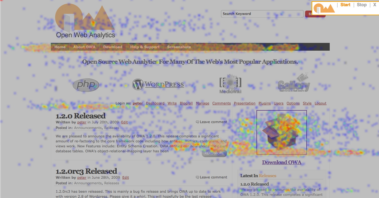 OWA统计即,Open Web Analytics ,是一个基于PHP/Open Flash Chart/Ajax技术的开源的网站流量统计系统,除了数十种标准的Web分析指标,维度和报告外,OWA还具有一些高级功能,例如查看用户点击的热图、任何网页的详细用法、匿名用户会话的点击流、定义和跟踪无限数量的自定义站点操作、跟踪网页上所有DOM元素的点击次数。