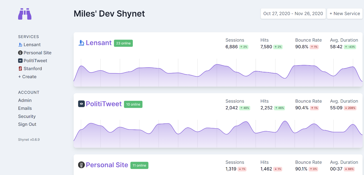 Shynet统计是免费开源的网站统计分析工具,基于 Apache-2.0 协议,它甚至不需要JavaScript就可以统计,分析脚本十分轻量,代码还不到 1kb。不过,Shynet仅适用于个人网站统计需要,对于大流量的统计不推荐。安装环境是Docker。