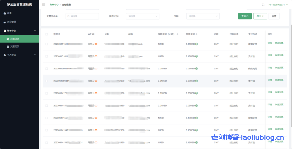 客户通过平台对公有云账号进行充值授信后,平台自动生成充值记录,每笔记录都有迹可循,用户可以在平台一键查询,并线上申请发票。