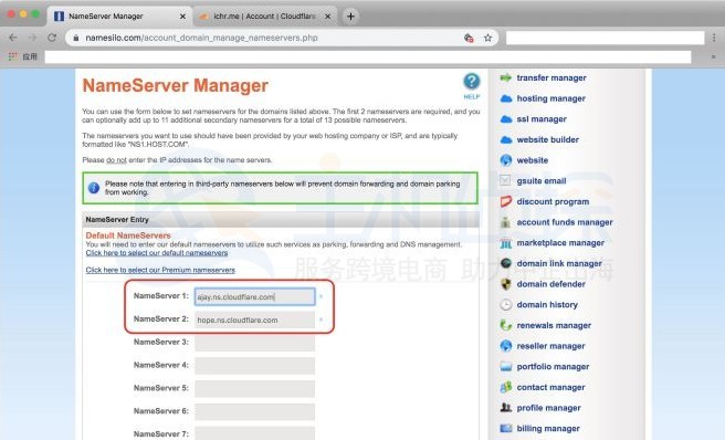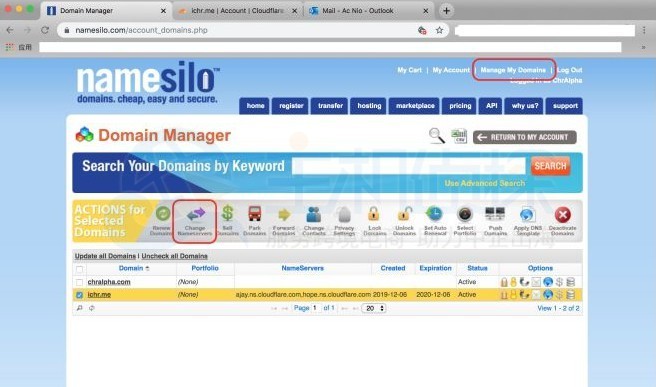 在 NameSilo 管理页面里将 Nameservers 修改成 Cloudflare 提供的 Nameservers。
