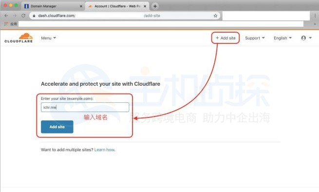 正常注册 Cloudflare 账号,点击 Add site 后输入自己的域名。