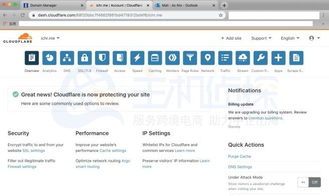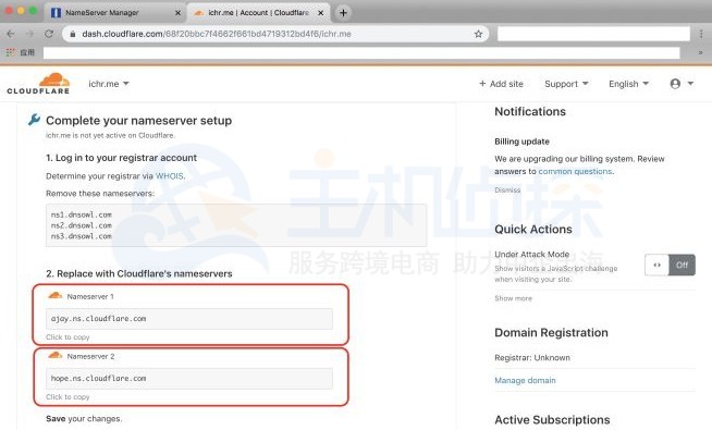 点击要管理的那个域名,上方的操作栏就会亮起来,这里用的比较多的就是 Change Nameservers。这里拿 CloudFlare 举例。