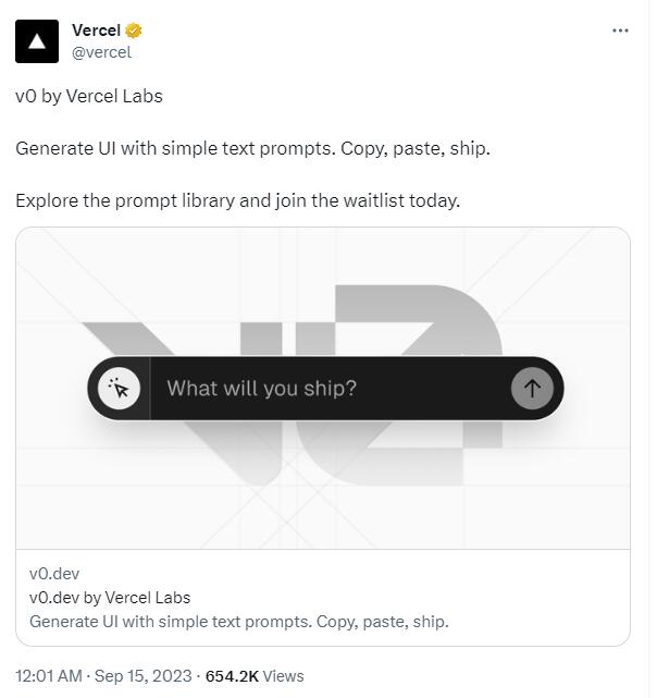 Vercel最新发布了v0版本的界面生成器,现在你可以通过自然语言描述生成界面代码,随后直接在预览中查看和调整生成的代码。完成后,你可以将代码复制下来,或者将应用部署在Vercel上。