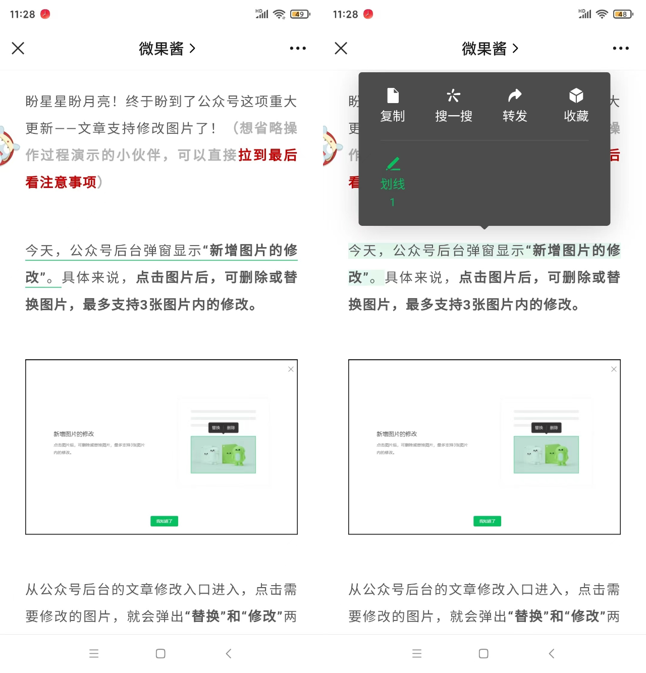 用户只需要长按公众号文章文本,在弹出的功能按钮中选择“划线”,就可以对文章内容进行标记。