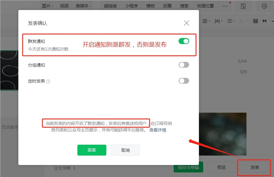1、要像原来那样群发文章,让用户可以接收到推送的步骤:点击编辑页面右下角的“发表”按钮—点击“群发通知”开关—点击弹窗下方的“发表”按钮。