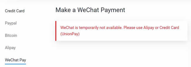 我们可以看到支持信用卡、支付宝、Paypal等付款方式。但是需要充值10美金作为激活账户,不会直接送的。需要注意的是暂时不支持微信充值,笔者已经试过了,见下图: