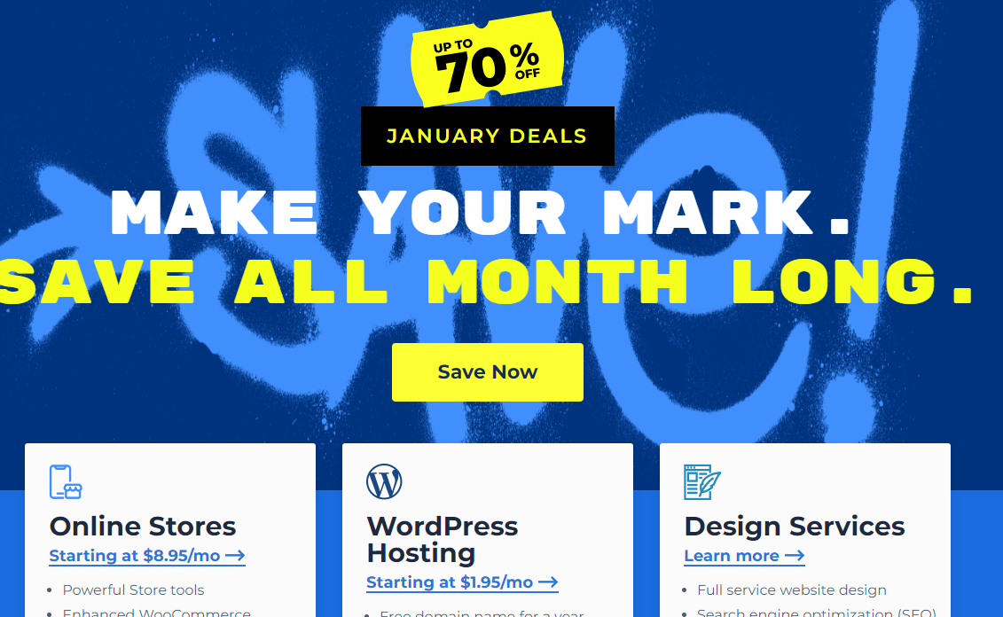 BlueHost作为备受推崇的一家主机商,主要产品有虚拟主机、WordPress主机等,并经常会推出优惠促销以吸引更多用户关注,近日BlueHost开启了一月特卖活动,WordPress主机、在线商店服务可享受高达70%折扣,特别实惠,快来看看吧。