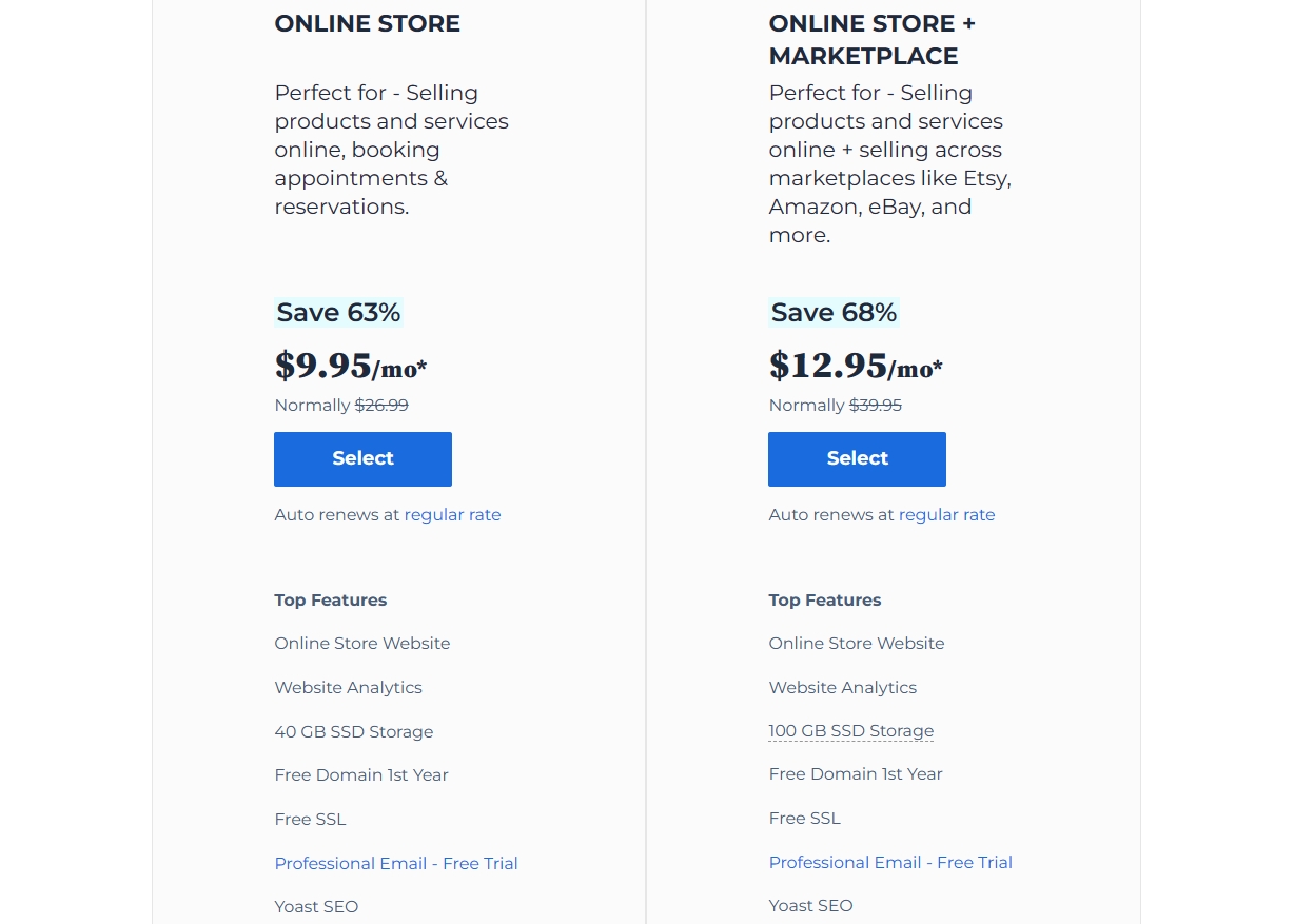 BlueHost在线商店是针对WooCommerce提供的服务,主要有两种套餐,ONLINE STORE和ONLINE STORE + MARKETPLACE,提供了网站建立、网站分析以及营销优化等一站式服务,存储空间充足,首年享免费域名等。