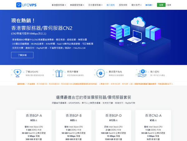 UFOVPS发布了龙年春节特别促销活动,限量提供全场5折优惠码,终身折扣,续费不涨价,还可以叠加季付9折/半年付8.5折/年付8折等优惠,同时可参与最大力度充值赠送活动,充200元赠送30元,最高充5000元获赠2500元。产品包含香港bgp(5~30M带宽)、香港cn2\cn2 gia(2~15M带宽)、日本cn2 gia(3~10M带宽)、美国国际bgp线路的VPS云服务器(100M带宽,自带10Gbps防御),美国高防VPS等等,支持支付宝、微信、PayPal等付款方式。