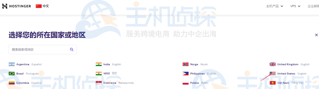 温馨提示:这次活动促销只有Hostinger英文站才有的,所以大家要去英文站下单购买。大家点击上面购买链接进入Hostinger中文站,然后点击左上角切换成美国就可以进入英文站。